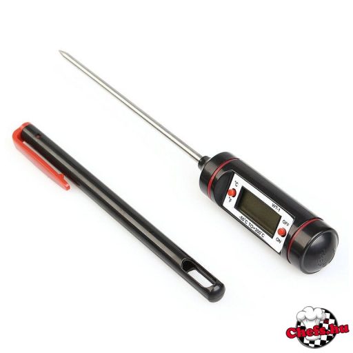 Kiváló minőségű, praktikus, zsebre csíptethető maghőmérő, mely mindig kéznél lesz, ha Ön sültjei belsejét, a csokoládé, a cukor vagy akár az olaj hőmérsékletét szeretné pontosan tudni. A hőmérő széles tartományban - 50 és +300°C közötti hőmérsékletet mér. A mérő szonda rozsdamentes acélból készül, és védő kupak is jár mellé. Használja ezt a remek hőmérőt és soha többet nem lesz túl forró az olaj, vagy száraz a sült.