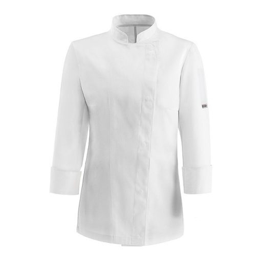 Fehér, patentos, hosszú ujjú, karcsúsított női szakácskabát.