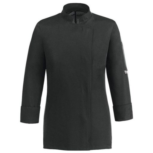 Fekete, hosszú ujjú, patentos, karcsúsított női szakácskabát.