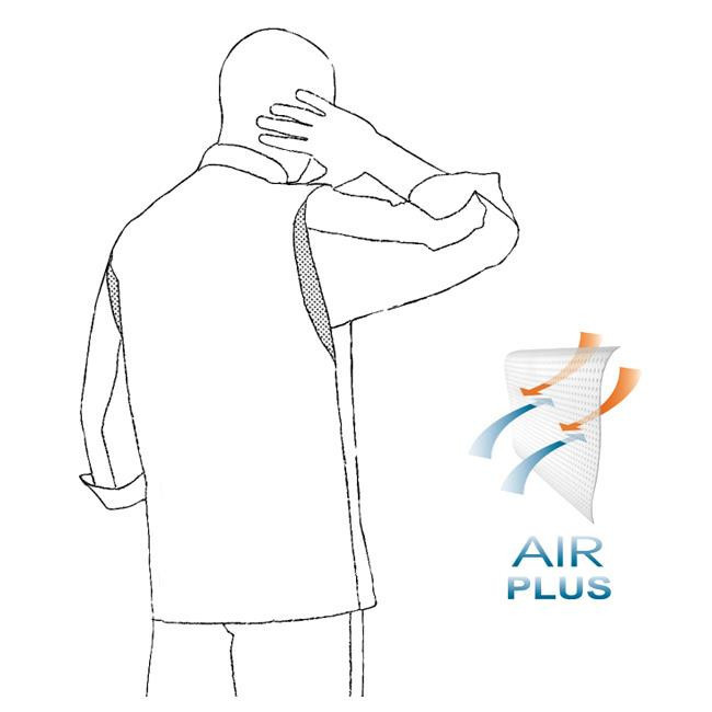 Az ujjai hátsó felén vállvonalban poliészter háló található, ami nagyobb mozgásteret ad a karnak és jobb szellőzést biztosít.