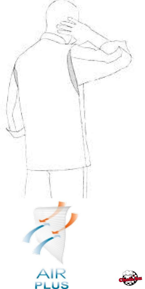 Szürke, hosszú ujjú, rejtett patentos szakácskabát, a vállrésznél szellőző hálóval.