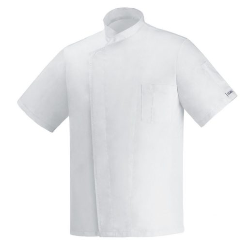 Fehér színű, rövid ujjú szakácskabát, szellőző hátrésszel, 100% mikroszálas anyagbó.