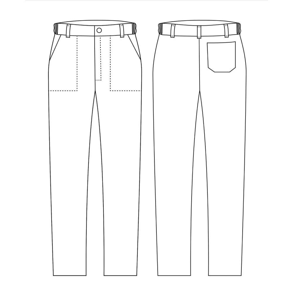 Gombos-cipzáras kivitelű szakácsnadrág kétoldalt kicsi gumi betoldással, két oldalzsebbel és egy farzsebbel a jobb oldalon.