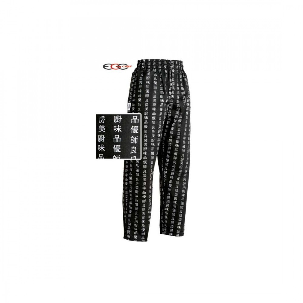 Fekete alapon, kínai írásjelekkel díszített szakácsnadrág teljesen gumírozott derékrésszel, megkötővel, két oldalsó és egy hátsó zsebbel.