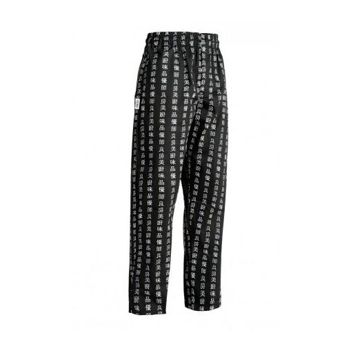 Fekete alapon, kínai írásjelekkel díszített szakácsnadrág teljesen gumírozott derékrésszel, megkötővel, két oldalsó és egy hátsó zsebbel.