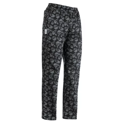Fekete alapon szürke színű koponyákkal díszített szakácsnadrág teljesen gumírozott derékrésszel, megkötővel, két oldalsó és egy hátsó zsebbel.
