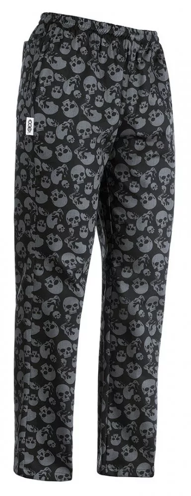 Fekete alapon szürke színű koponyákkal díszített szakácsnadrág teljesen gumírozott derékrésszel, megkötővel, két oldalsó és egy hátsó zsebbel.