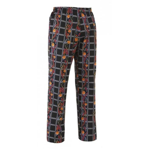 Fekete alapon színes paprikákkal és kockákkal díszített szakácsnadrág teljesen gumírozott derékrésszel, megkötővel,