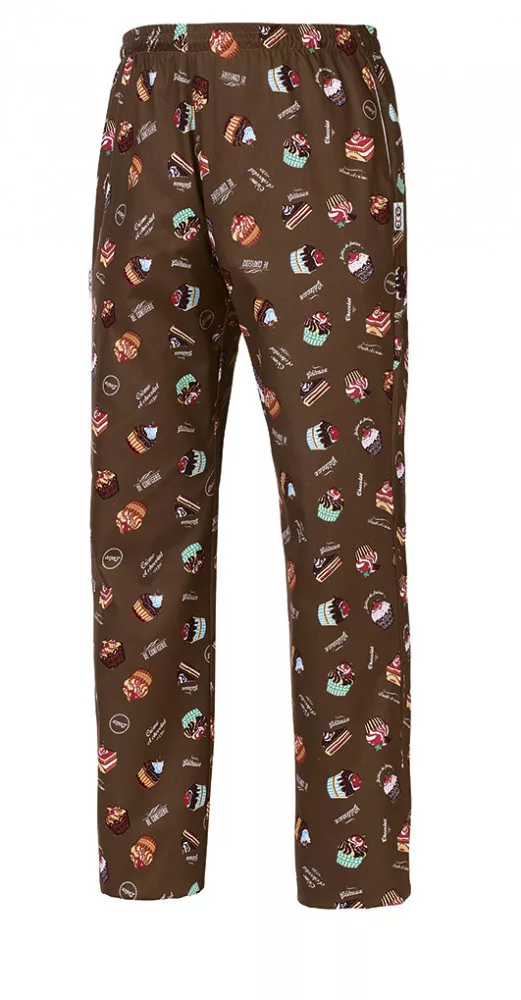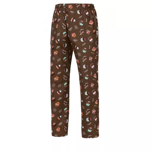 Barna alapon tortamintákkal díszített szakácsnadrág teljesen gumírozott derékrésszel, megkötővel, két oldalsó és egy hátsó zsebbel.
