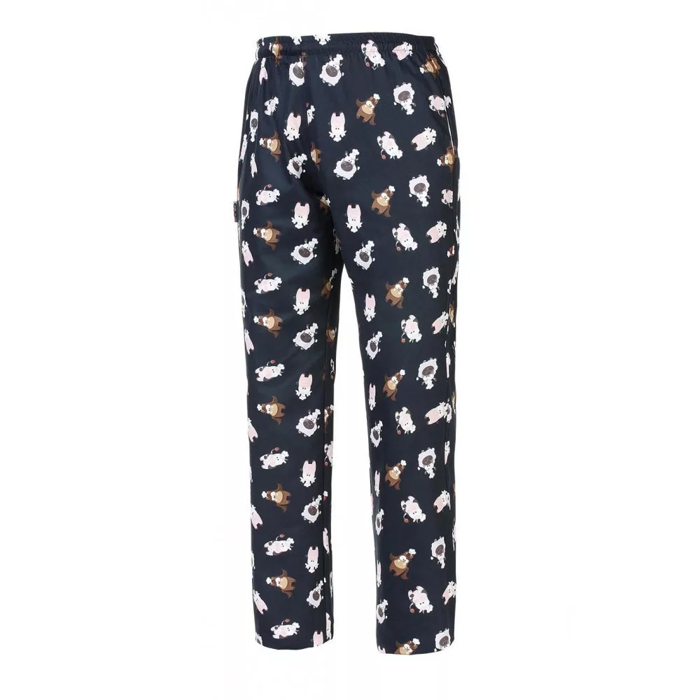 Fekete alapon kisállatokkal díszített szakácsnadrág teljesen gumírozott derékrésszel, megkötővel, két oldalsó és egy hátsó zsebbel.