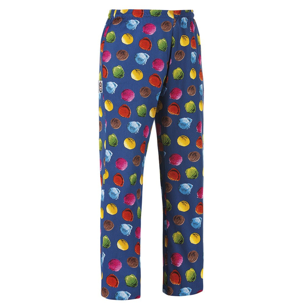 Színes fagylalt gomboccokkal díszített szakácsnadrág teljesen gumírozott derékrésszel, megkötővel, két oldalsó és egy hátsó zsebbel.