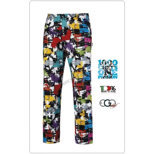 Világos alapon fekete,sárga, piros, kék lila festékfoltokkal díszített szakácsnadrág teljesen gumírozott derékrésszel, megkötővel, két oldalsó és egy hátsó zsebbel.