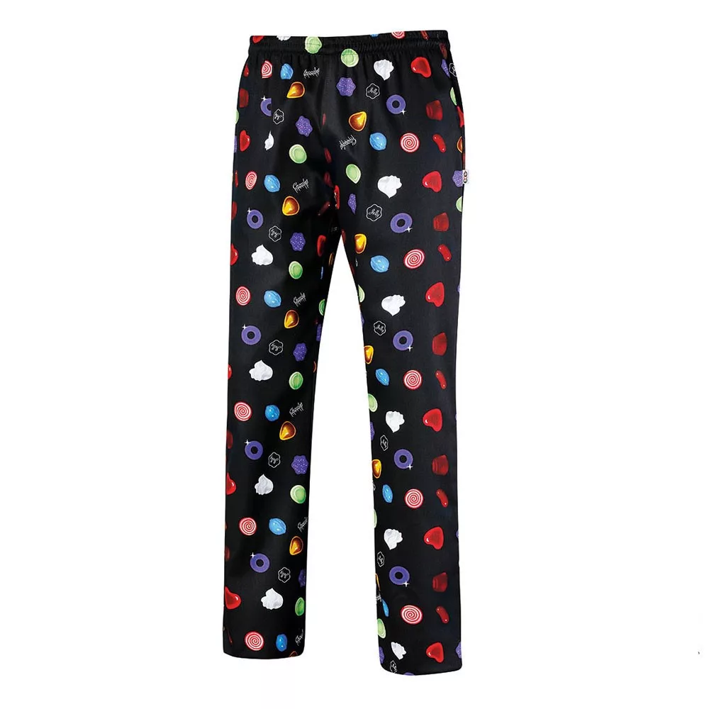 Fekete alapon BON BON-okkal díszített szakácsnadrág teljesen gumírozott derékrésszel, megkötővel, két oldalsó és egy hátsó zsebbel.