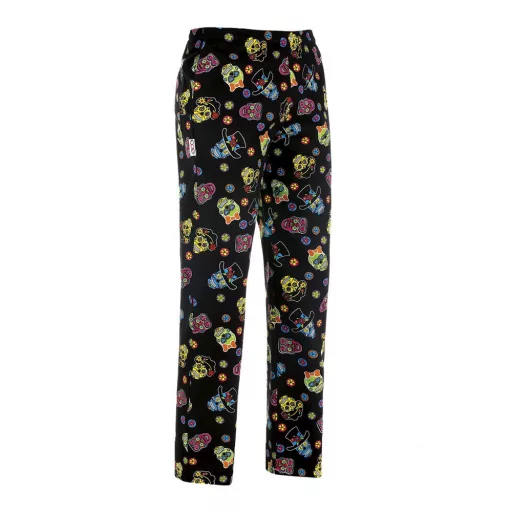 Fekete alapon mexicoi mintákkal díszített szakácsnadrág teljesen gumírozott derékrésszel, megkötővel, két oldalsó és egy hátsó zsebbel.