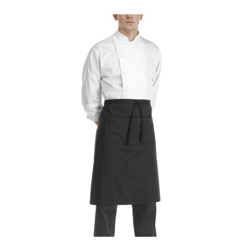 Fekte derékraköthető szakácskötény, elől egy nagyobb méretű dupla zsebbel.