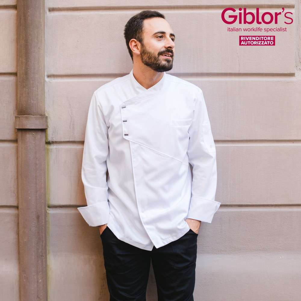 Divatos, fehér, patenttal záródó szakácskabát, az olaszországi, prémium minőségű szakácsruha gyártó GIBLOR'S-tól.