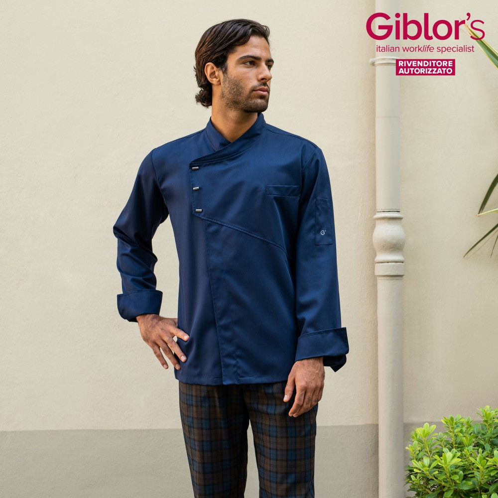 Divatos, sötétkék színű, patenttal záródó szakácskabát, az olaszországi, prémium minőségű szakácsruha gyártó GIBLOR'S-tól.