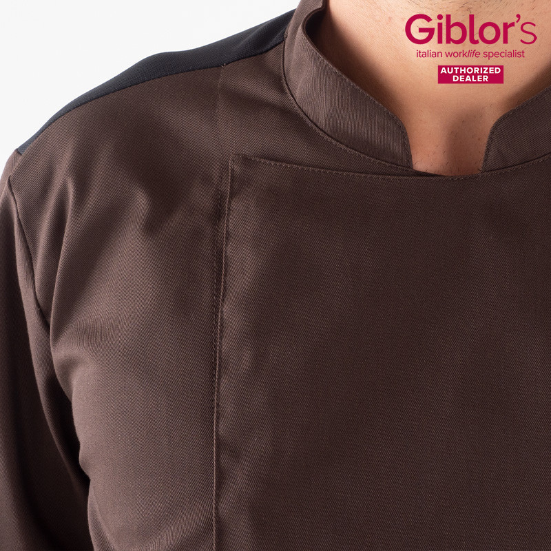 Slim Fit szabású, álló gallérral, hagyományos felfelé gombolással és mellzsebbel.