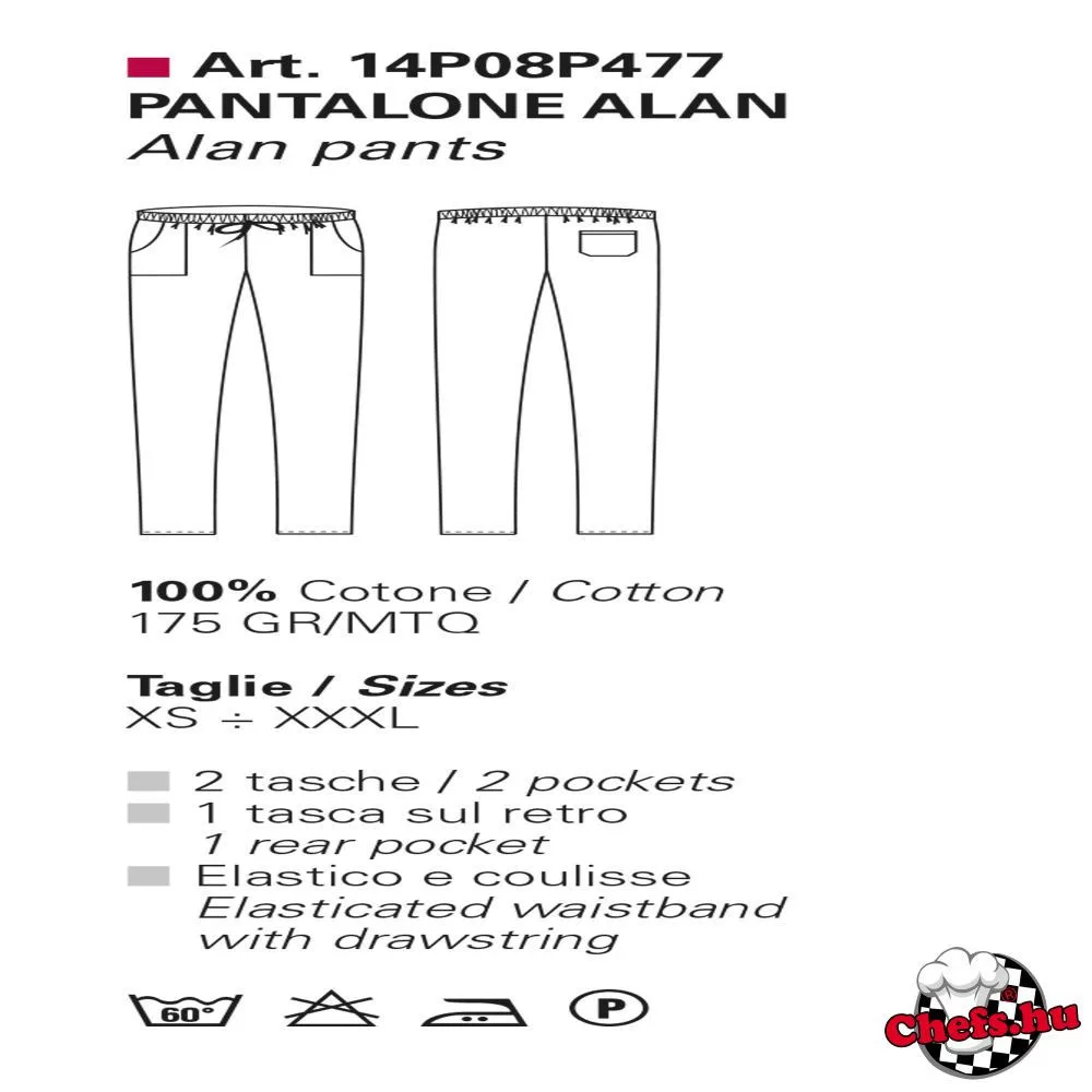 Kötős derekú szakácsnadrág két oldalzsebbel és egy hátsó zsebbel az olaszországi prémiumkategóriás szakácsruha gyártó Giblor's cégtől.
