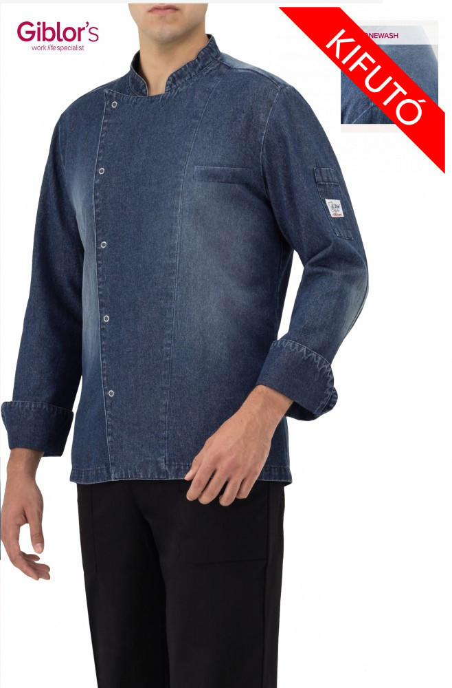 Gyönyörűszép, patenttal záródó, kőmosott farmerből készült szakácskabát az olaszországi prémiumkategóriás szakácsruha gyártótól, a Giblor's-tól.