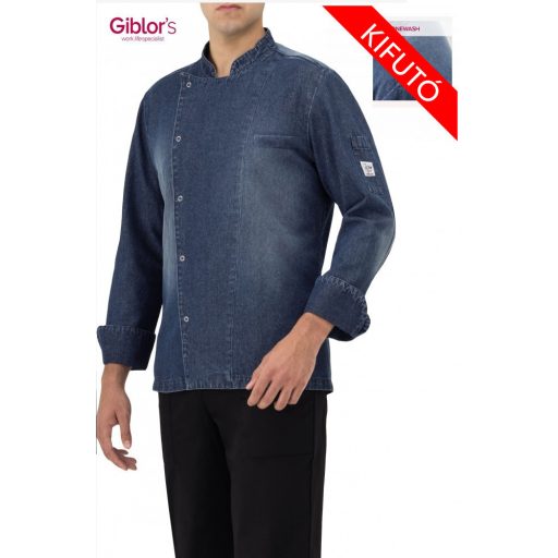 Gyönyörűszép, patenttal záródó, kőmosott farmerből készült szakácskabát az olaszországi prémiumkategóriás szakácsruha gyártótól, a Giblor's-tól.