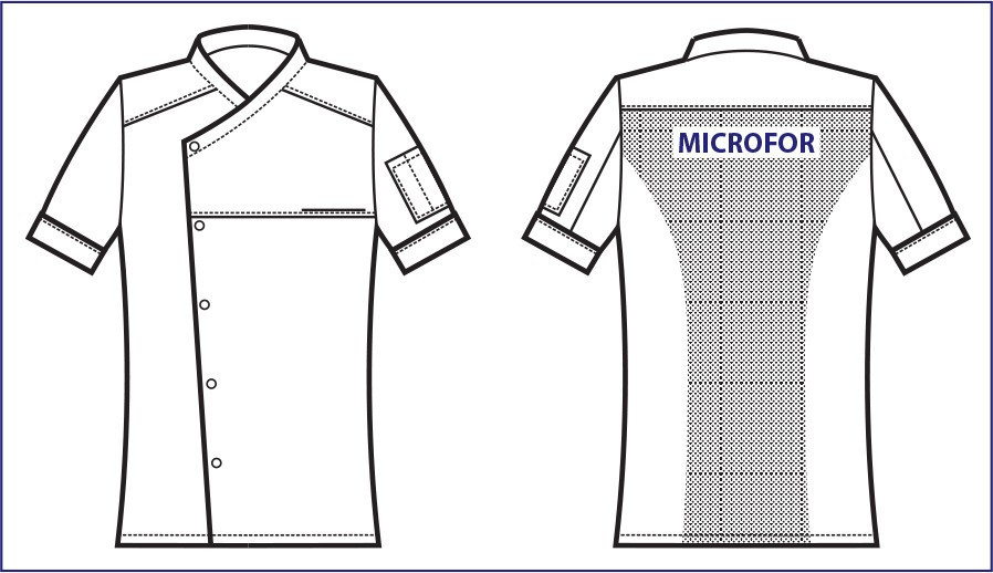 Nagyon vékony, rugalmas pamut anyagból készült rövidujjú szakácskabát, a hátán szellőző hálós betéttel. A bal mellrészen és a bal ujján egy-egy tollzseb található.
