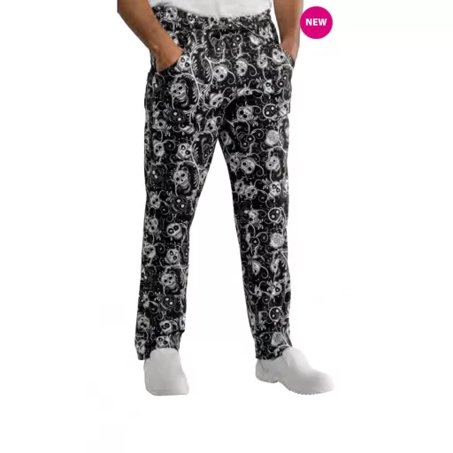Gumis, kötős derekú, koponyákkal díszített szakácsnadrág két rávarrt oldalzsebbel és egy hátsó zsebbel.