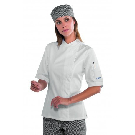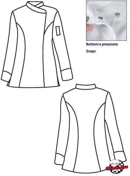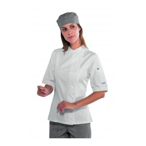 Gyönyörű szabásvonalú, enyhén karcsúsított női szakácskabát az olaszországi ISACCO cégtől.
