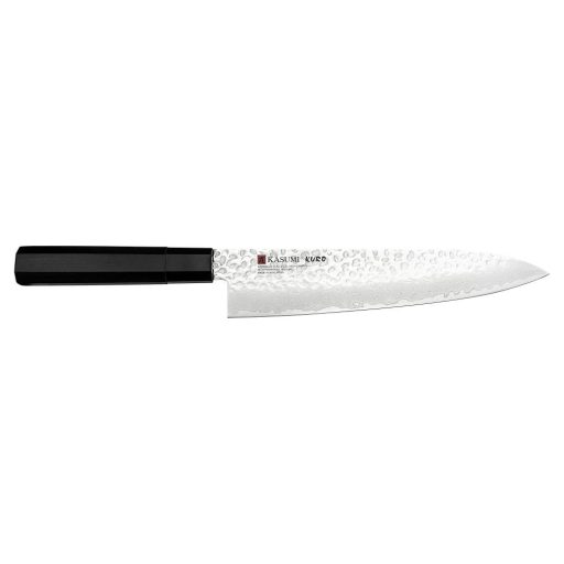 A Kasumi Kuro fő vágólapja molibdén vanádium acélból (AUS8) készül. A pengék a Rockwell C58-hoz edzettek. A kések mindkét oldalán gyönyörű, 32 rétegű damaszkuszi minták találhatók. Kalapácsolt kivitel. Hagyományos japán stílusban. A Kalapácsos felület megakadályozza az ételek tapadását. A fogantyú nyolcszög alakú, így könnyen megfogható. Erős, fekete, laminált megerősített fából készült.