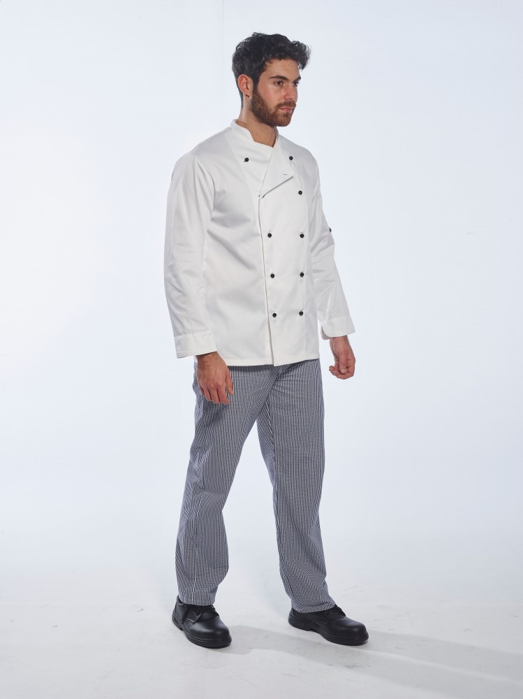 Divatos, magas minőségű alapanyagból készült séfkabát. Bőrbarát kevert szálas anyaga rendkívüli módon szín- és mérettartó.