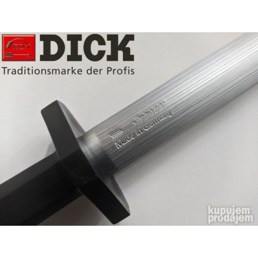 A hosszú idő óta jól bevált F. Dick élező acélpenge, ergonomikus kialakítású markolattal, ujjvédelemmel, a fogantyú végén acélkarikával. Biztonságos és higiénikus, a hatályos élelmiszeripari szabályozásoknak megfelelő.