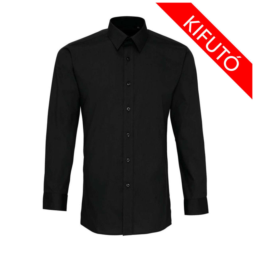 Vasaláskönnyített, karcsúsított, fekete színű, hosszú ujjú férfi ing.