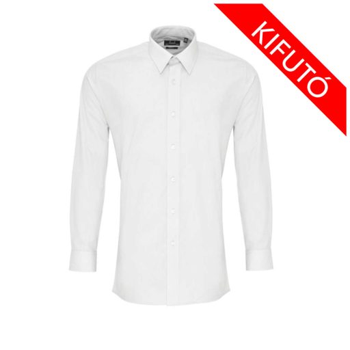 Vasaláskönnyített, karcsúsított, fehér színű, hosszú ujjú férfi ing.