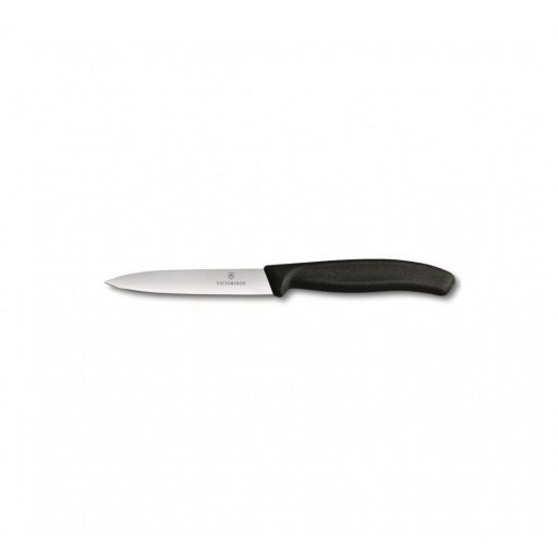 Svájci konyhai kés műanyag markolattal és 10 cm hosszú, kiváló minőségű rozsdamentes acélból. A kés elsősorban zöldség és gyümöcs hámozására és szeletelésére alkalmas.