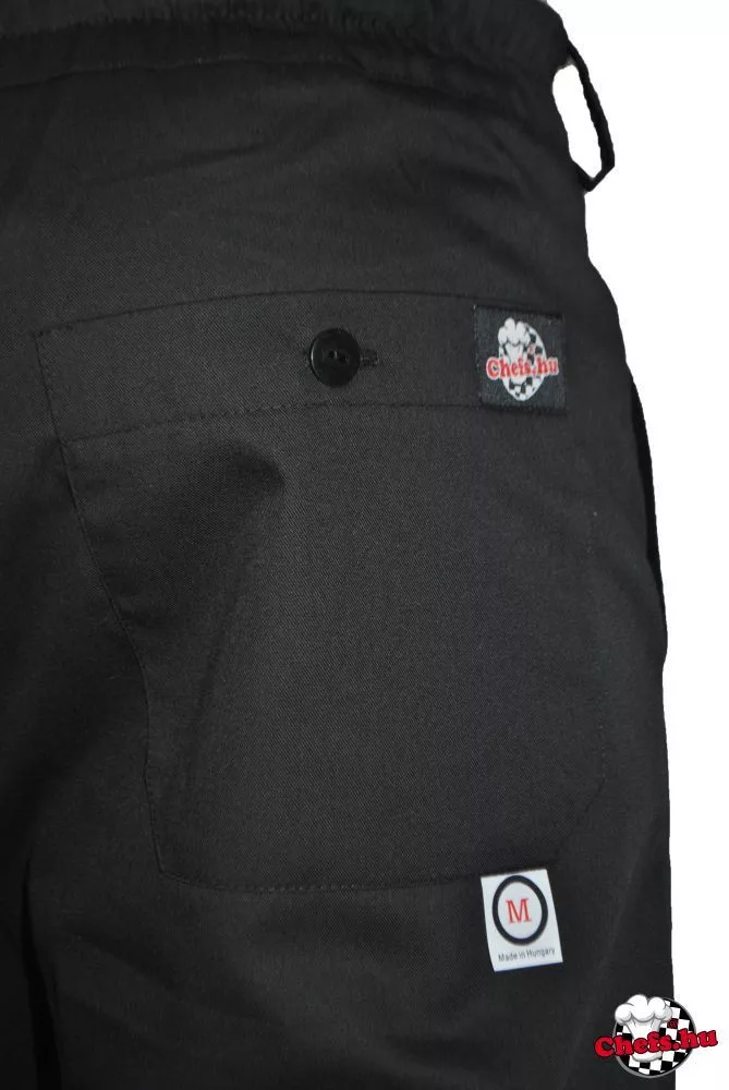 Gombos-cipzáras, hátul teljesen gumírozott kivitelű szakácsnadrág.